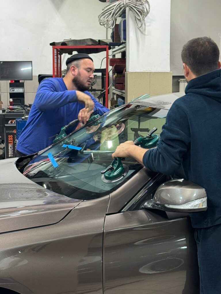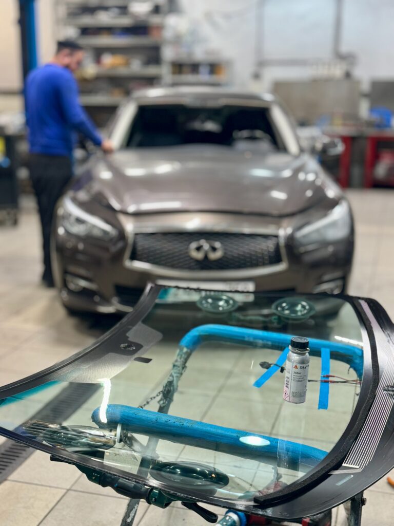 • Перед установкой новое стекло обрабатывается праймером, а кузов — активатором и клеем.